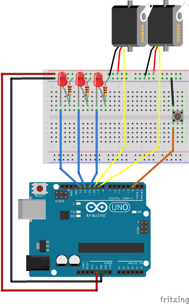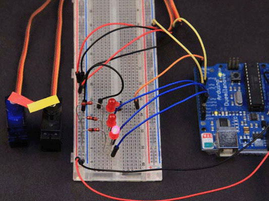 First hook up a couple of servos on your breadboard as shown below.  As long as we are at it, let's hook up a third LED too.
