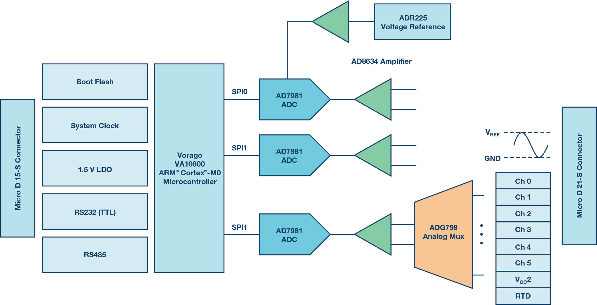 EV-HT-200CDAQ1 di ADI si basa sul progetto di riferimento front-end analogico CN0365. Basato sul convertitore SAR analogico-digitale AD7981, questo progetto di riferimento illustra un sistema a piena funzionalità con due canali campionati simultaneamente ad alta velocità insieme a otto canali multiplati aggiuntivi. Il front-end analogico è collegato al microcontroller VA10800 di VORAGO Technologies basato su Arm Cortex-M0 tramite porte per interfaccia periferica seriale (SPI). I dati possono essere elaborati localmente o trasmessi tramite un UART o un'interfaccia di comunicazioni RS-485 opzionale. Altri componenti di supporto su scheda includono memoria, clock, alimentazione e componenti passivi. Oltre all'hardware, è fornito firmware open-source per il progetto utilizzando FreeRTOS con driver ottimizzati e un protocollo di acquisizione dati con diversi modalità di funzionamento. Il software PC open-source incluso consente agli utenti di collegarsi alla scheda tramite UART per controllare le modalità di acquisizione, visualizzare e registrare i dati ed eseguire l'analisi del segnale. Questa piattaforma è idonea per la progettazione di riferimento, la prototipazione rapida (es. nuove tecniche di rilevamento) e per i test in laboratorio di sistemi con strumentazione per alte temperature.