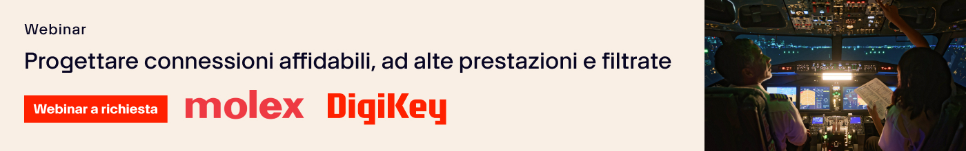Molex e DigiKey assistono gli architetti dei sistemi aerospaziali e di difesa fornendo loro soluzioni di connettività all'avanguardia che soddisfano o superano gli standard normativi. Grazie alla nostra esperienza congiunta in prodotti schermati contro EMI e RFI, i clienti possono affrontare sfide complesse di progettazione, migliorare la sicurezza e ottenere un vantaggio competitivo nei settori aerospaziale e della difesa. Le opportunità di progettazione, come l'elettrificazione dei velivoli o la trasformazione delle applicazioni aerospaziali attraverso sistemi autonomi e IoT, sono supportate da 140 anni di esperienza combinata di Molex e AirBorn, una società di Molex.